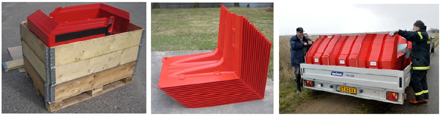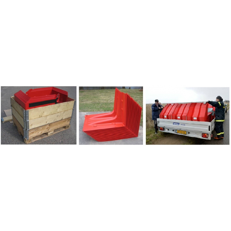 Esto significa que NOAQ Boxwall se puede configurar rápida y fácilmente. Dos personas pueden construir un muro de 200 m de largo en una hora. La pared se monta insertando las cajas entre sí. No se requieren herramientas. Construyes curvas girando ligeramente las cajas al juntarlas. Hay elementos de esquina separados para esquinas y curvas pronunciadas. El NOAQ Boxwall también se puede utilizar para desviar o desviar inundaciones repentinas después de tormentas eléctricas o lluvias intensas. Los elementos también se pueden colocar en el flujo existente. Las cajas son apilables y ocupan poco espacio durante el transporte y almacenamiento. Un europalet (120x80x112 cm) tiene capacidad para 26 cajas (23 metros) y se entrega en una caja de madera con tapa. También están disponibles contenedores rodantes especiales, que facilitan aún más rápidamente el uso de los elementos o su transporte en camiones de bomberos.