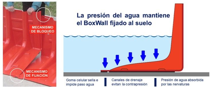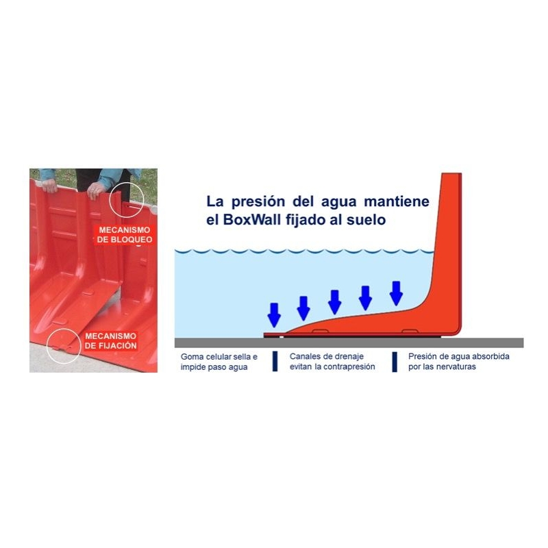 Está diseñado para superficies planas como carreteras asfaltadas, pero también es parcialmente adecuado para césped. Boxwall BW52 es autoanclable y forma una presa de 50 cm de altura. Está lastrado y anclado únicamente por el peso del agua represada. No son necesarias fijaciones.
