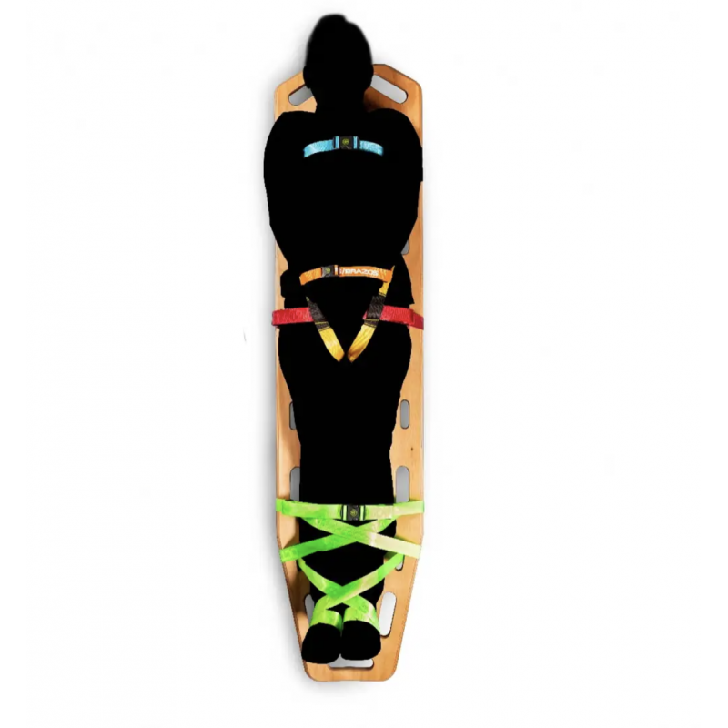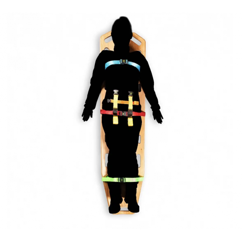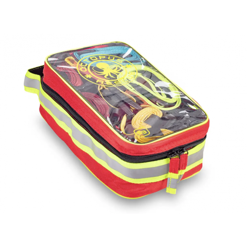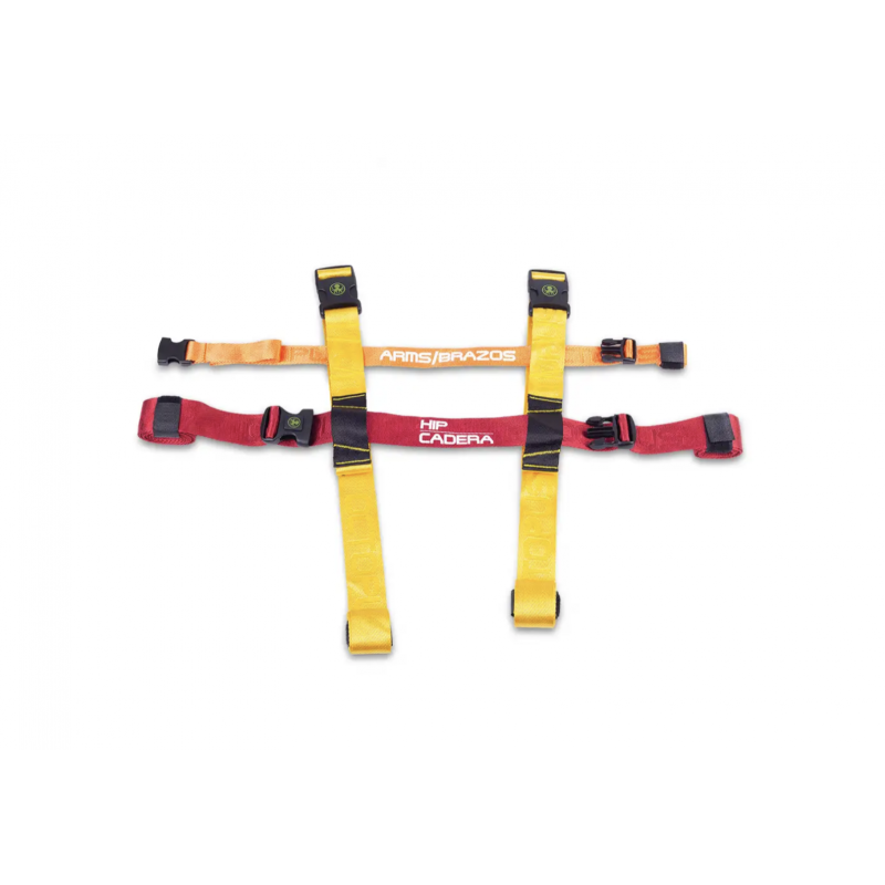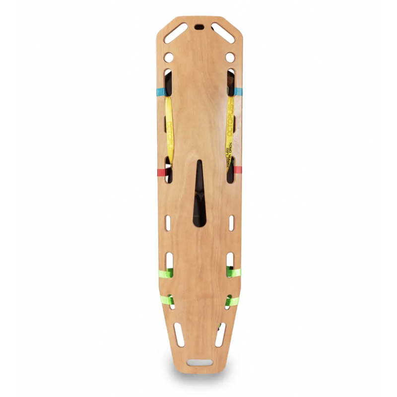 Octopus Rescue System, es un sistema de correas que permite inmovilizar de forma segura y eficiente a cualquier sujeto en un tablero espinal. Está diseñado para una mayor facilidad de encinchado y ajuste máximo, evita el deslizamiento tanto horizontal como vertical durante una evacuación o rescate. El color de cada cinta identifica la función y posición de colocación en el sujeto, tal que: Cinta azul (1), nivel axilas; Cinta naranja (1), sujeción brazos; Arnés triangular: Cinta roja (1), nivel de la cadera, Cintas amarillas (2), en “V” cresta iliaca; Cinta verde (1), nivel inferior rodillas-pies; cinta negra (1), para ampliación de sujeción de 1metro. Además, cada correa esta serigrafiada con indicaciones de posición y cierre tridente con hebilla ajustable para una máxima fijación. Con cierre de seguridad en cinta roja de cadera para evitar la manipulación por el sujeto.