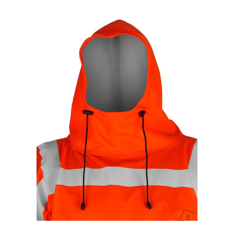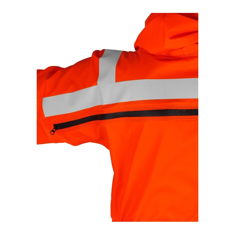 Los usuarios apreciarán el cierre de cremallera a prueba de salpicaduras y la capucha y los puños ajustables en las mangas. Producto disponible bajo pedido.
