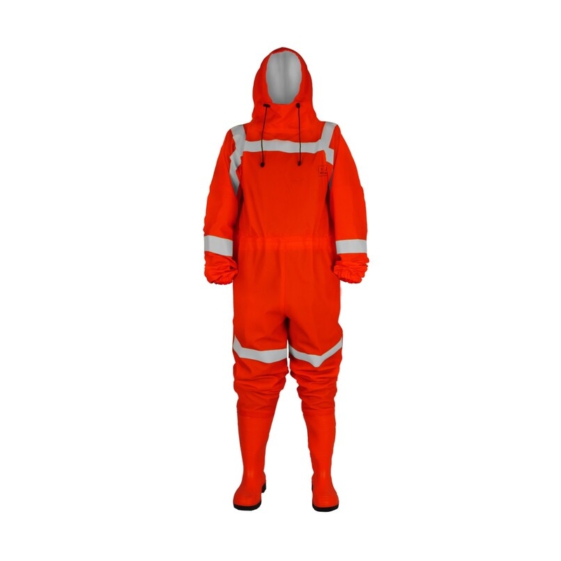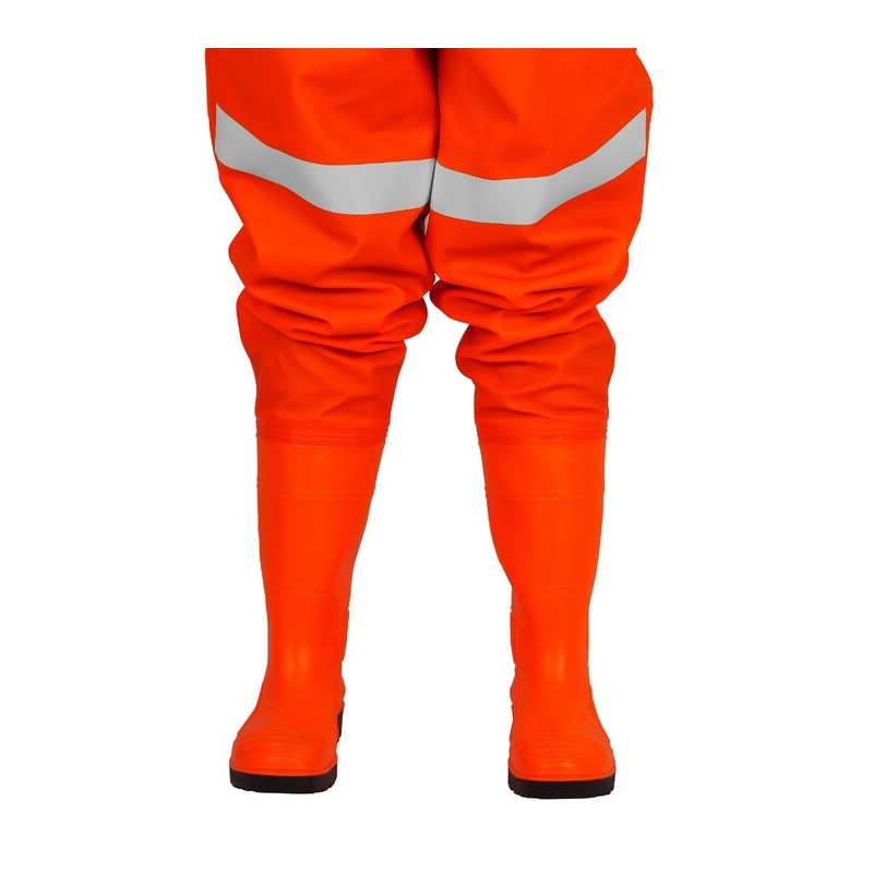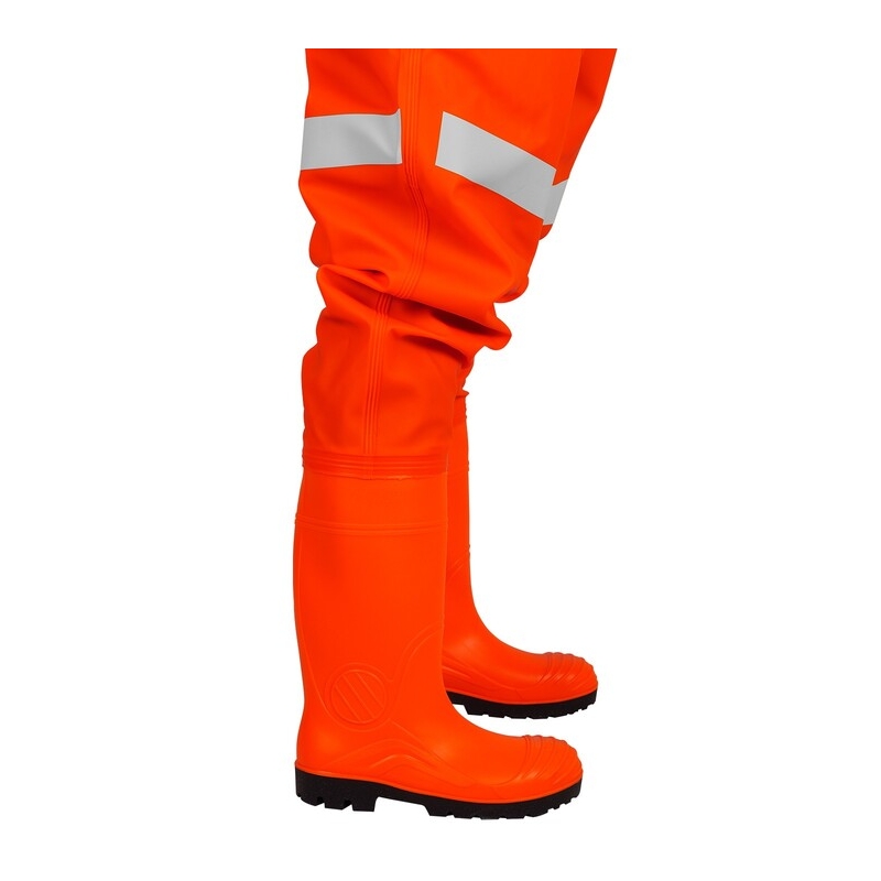 Fabricado con materiales recubiertos de PVC de la mejor calidad en dos espesores. La visibilidad y la seguridad del usuario se ven aumentadas por franjas de cinta de advertencia reflectante y fosforescente. Las botas de agua Safe S5 combinadas con la parte superior protegen adicionalmente los pies del usuario.