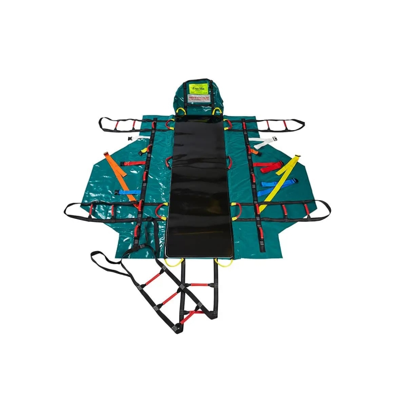 Incorpora grandes alas laterales y correas cruzadas codificadas por colores fáciles de usar, que mantienen a la persona bien sujeta y el peso corporal en su sitio, proporcionando una solución para la estabilización de la masa corporal y haciendo que el movimiento del EMS EvacMat sea más estable.