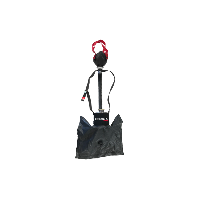 Xtreme-K respirador generador de Oxígeno Químico, de circuito cerrado, de un único uso y limitado, para la protección de las vías respiratorias en caso de emergencia o atrapamiento. Dispositivo de supervivencia con una autonomía no inferior a 20 minutos. Dispone de bandas ajustables para su uso con o sin casco.