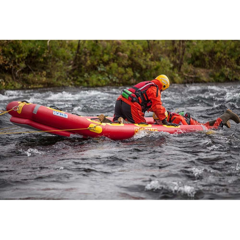 Trineo de rescate o plataforma de rescate para aguas bravas de la con la proa elevada y gran volumen en la proa. El trineo es capaz de maniobrar eficazmente en sistemas de rescate con ataduras en proa eficaces para aguas bravas y rescates, reduciendo el riesgo de que la proa se sumerja.