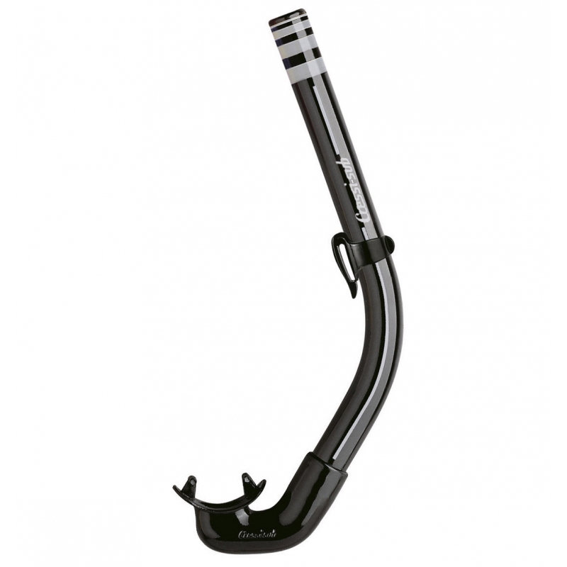 Tubo clásico polivalente para apnea, buceo y snorkeling | Perfil anatómico y proporciones muy equilibradas | Tubo en PVC semiflexible e irrompible | Boquilla en silicona negra de diseño ortodóncico | Uso lado indistinto | Sistema de enganche para la máscara ajustable en altura.