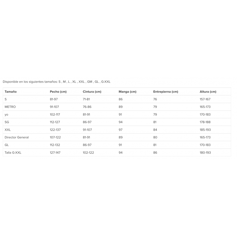 Disponible en los siguientes tamaños: S , M , L , XL , XXL , GM , GL , G-XXL