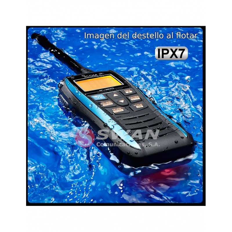 El transceptor IC-M25EURO flota y cumple con el grado de protección contra el agua IPX7 que le permite sumergirse hasta 1 metro de profundidad durante 30 minutos. Además viene equipado con una luz roja destelleante que se ilumina en contacto con el agua. Esta luz junto con la retroiluminación de la pantalla y del teclado nos permite ver donde se encuentra el equipo.