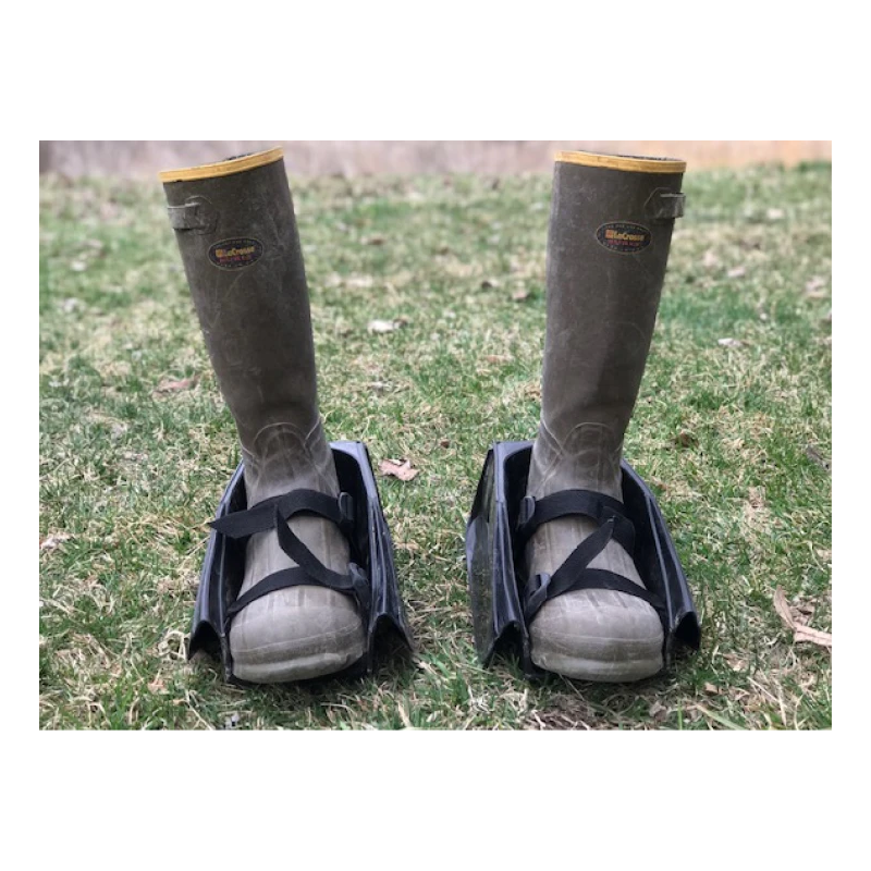 Las botas Mudderboot están diseñadas para evitar que te hundas en el barro, la arena, la nieve y otras superficies blandas. Son ligeras, se adaptan a la mayoría de los calzados y están diseñadas de tal forma que las "alas" permanecen cerradas hasta que pisas terreno blando, lo que hace que sea fácil caminar con ellas también en terreno firme.