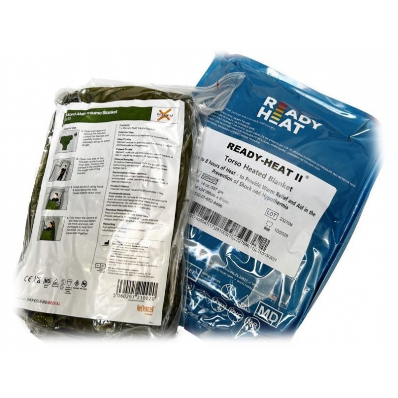 El pack GCH incluye una manta auto-calentable para torso READYHeat que proporciona una temperatura de 38º C hasta 8 horas y una manta Blizzard de 3 capas con tecnología Reflexcell® de alta capacidad de reflexión térmica lo que proporciona un conjunto altamente idóneo para la prevención y gestión de la hipotermia.