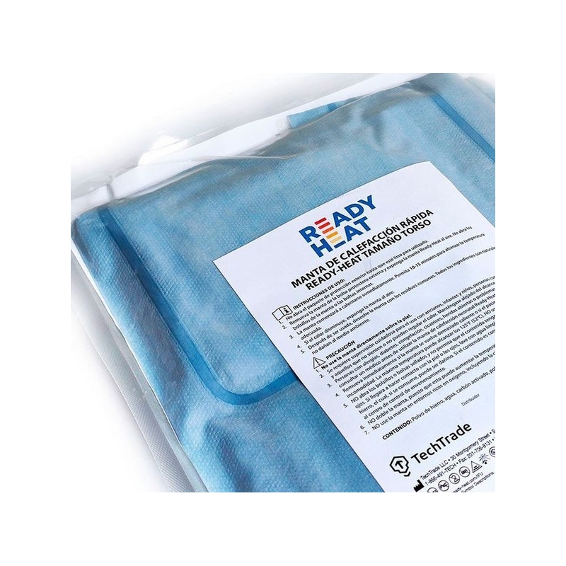Ready-Heat™ II proporciona una solución eficaz en el mantenimiento de la temperatura del paciente ante un shock, trauma o hipotermia. Ideal para equipos de rescate y salvamento, hospitales o fuerzas de Seguridad. La manta se calientan hasta 37,8 ºC en 10 minuto, sólo con abrir la bolsa de forma espontánea, sin necesidad de electricidad ni equipos auxiliares. Envasada en una bolsa de polietileno, al vacío, libre de oxígeno. Al abrir la bolsa, los paneles de la manta reaccionan con el oxígeno de la atmósfera generando calor. Funciona bien en grandes altitudes y ambientes pobres de oxígeno.