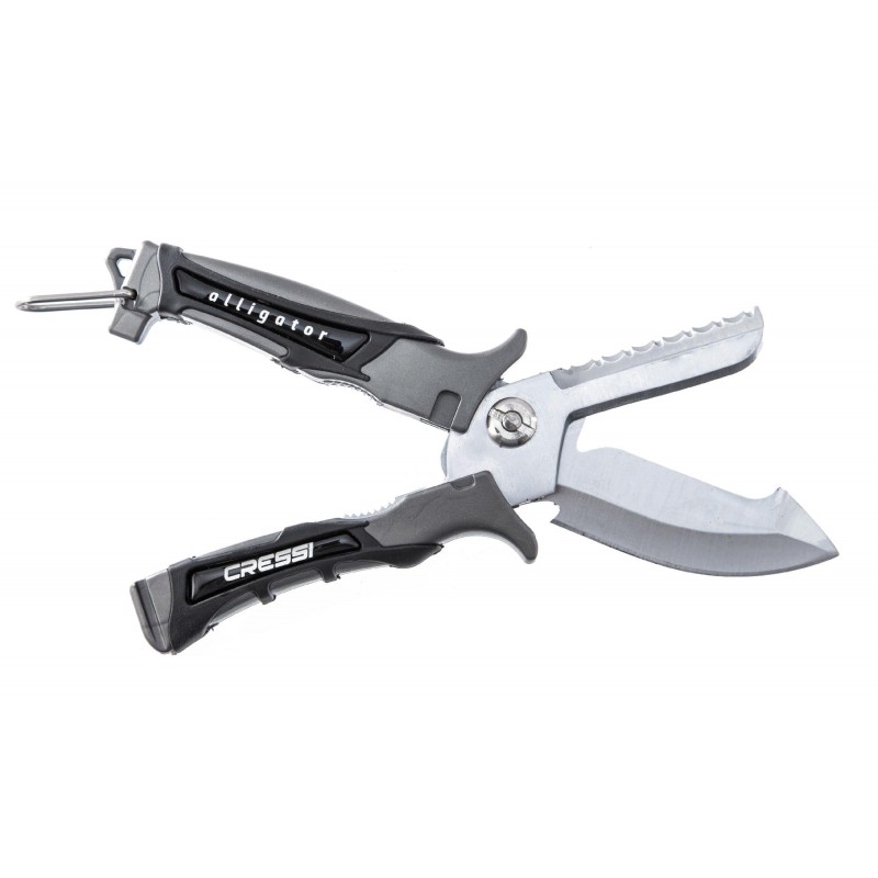 Realizado en acero inoxidable de alta resistencia, es útil como tijera, como cuchillo con filo liso como con sierra, y también cuenta con un rebaje útil como cortacabos. Incluye dentado para uso como alicate.