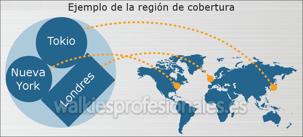 El área de cobertura se puede dividir en diferentes regiones de cobertura, utilizando círculos, cuadrados y rectángulos. Por ejemplo, puede asignar áreas de cobertura a Tokio, Nueva York y Londres. Se puede cambiar el grupo de conversación y/o la región dentro de un área de cobertura de manera flexible en el sitio web de Iridium. Cambiar el contenido de un contrato puede requerir una solicitud por adelantado.