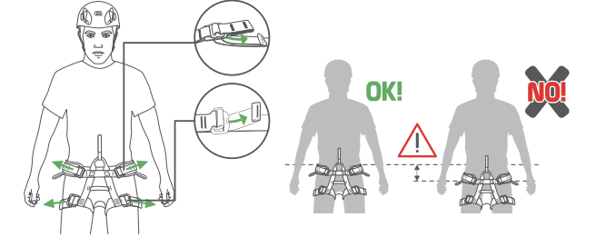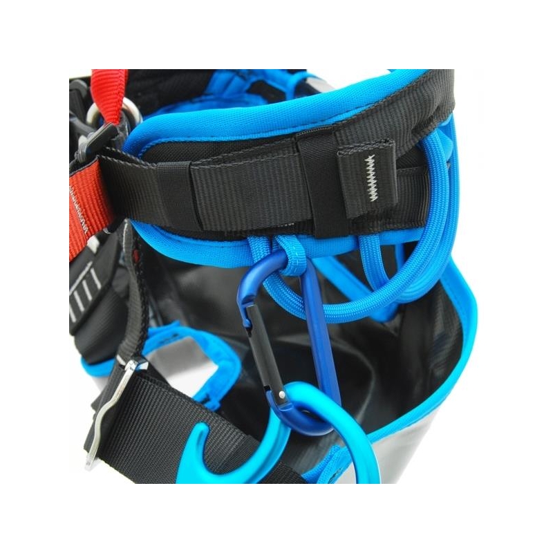 Equipado con ojales laterales especiales para la colocación de mosquetones específicos con la función de alojamiento del equipo de amarre y descensor.