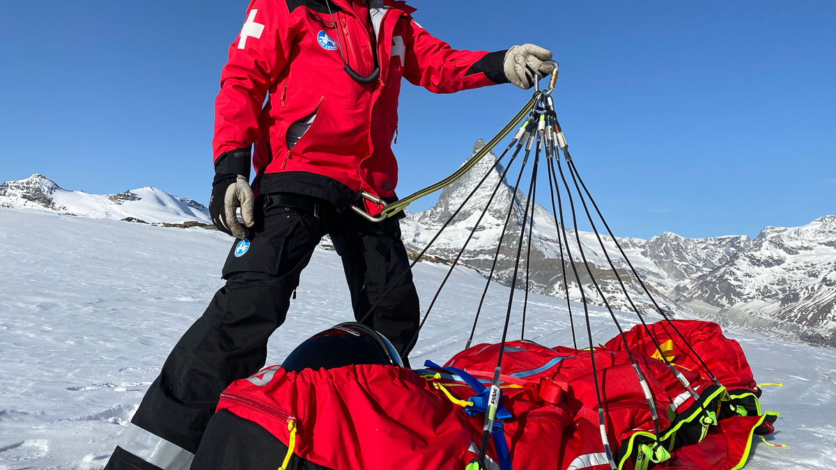 Una sola persona puede utilizar este sistema incluso en condiciones climáticas adversas y ventosas. La secuencia de correas adaptables y los colgantes de rescate PAX permiten transportar al paciente como una carga externa.