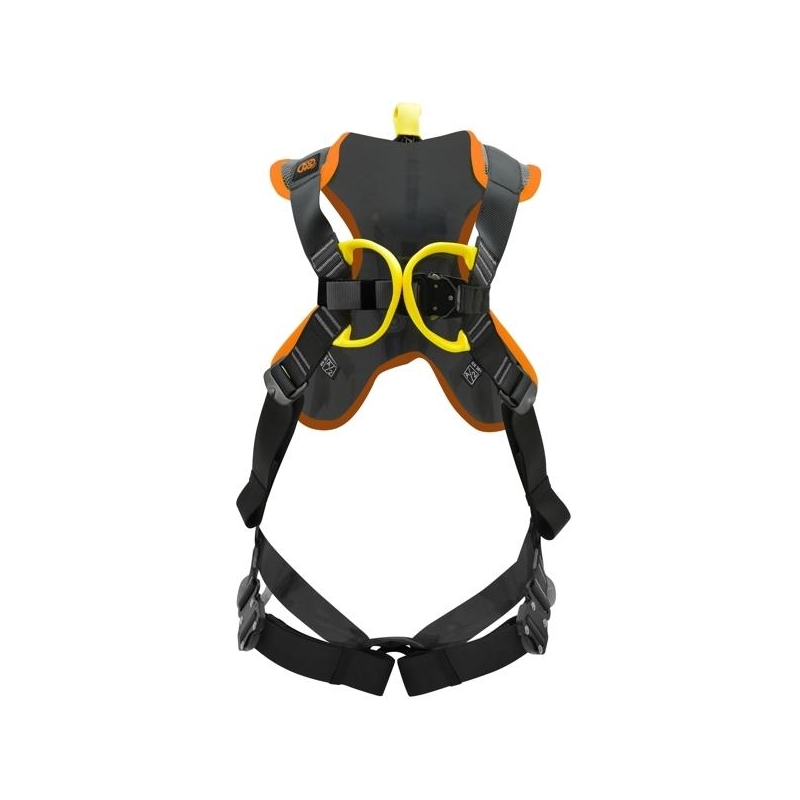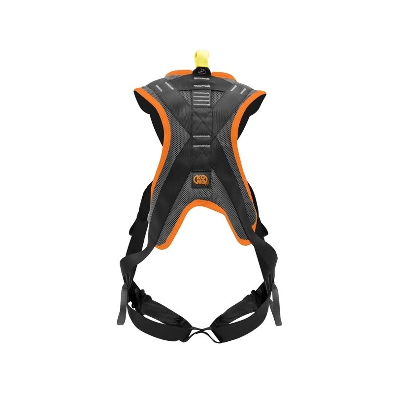 Arnés especial para trabajo en altura y actividades de rescate, equipado con un amplio acolchado trasero rediseñado, ergonómico y transpirable que hace que el vendaje sea rápido y fácil. Hebillas rápidas en las perneras. Enganche dorsal desplazado hacia arriba, de fácil acceso incluso durante el transporte de material al hombro (bombonas de oxígeno, mochilas, etc...).