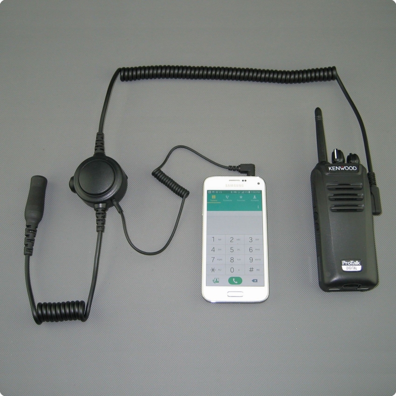 La interfaz del adaptador tiene una clavija de 3,5 [mm] de 4 pines con la que se contacta IOS / Android, un cable de conexión específico para la radio y una toma de acoplamiento de 7,11 [mm] compatible con TP-120 (Peltor / Nato).