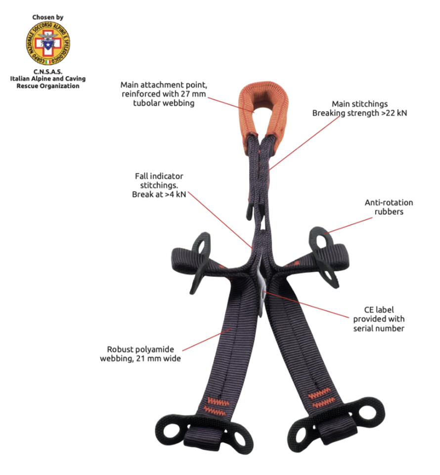 Dispositivo de anclaje múltiple Omino Heli de Camp Safety que permite crear 4 puntos de anclaje a partir de uno solo. Diseñado especialmente para las operaciones de rescate en helicóptero con cabrestante, también es útil para otras aplicaciones técnicas donde existe la utilidad de un multianclaje flexible.