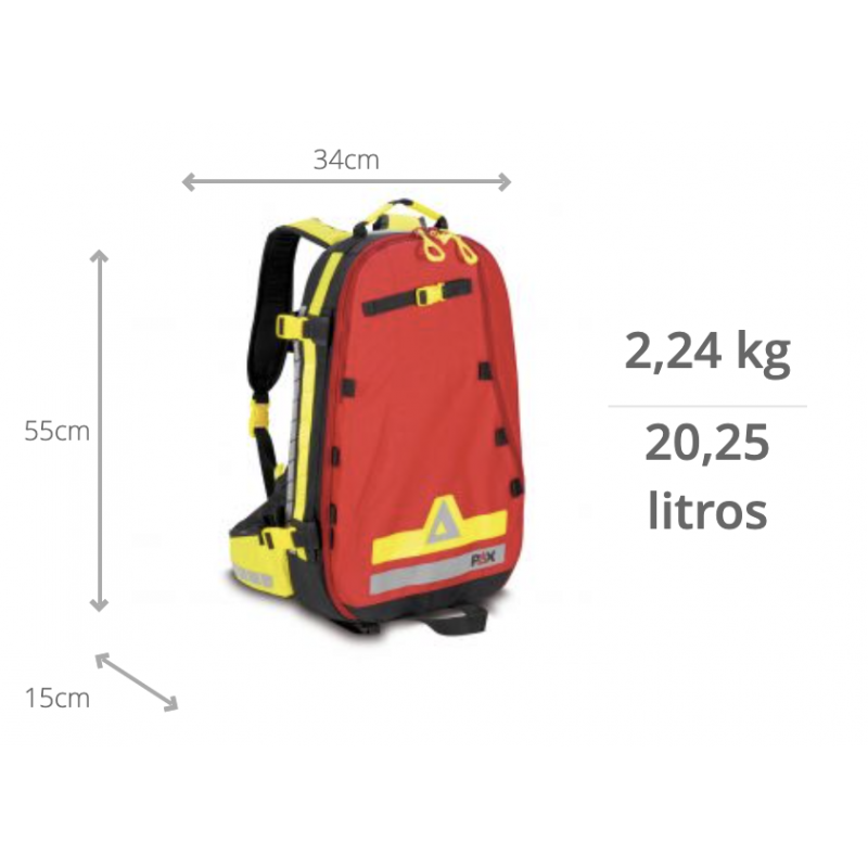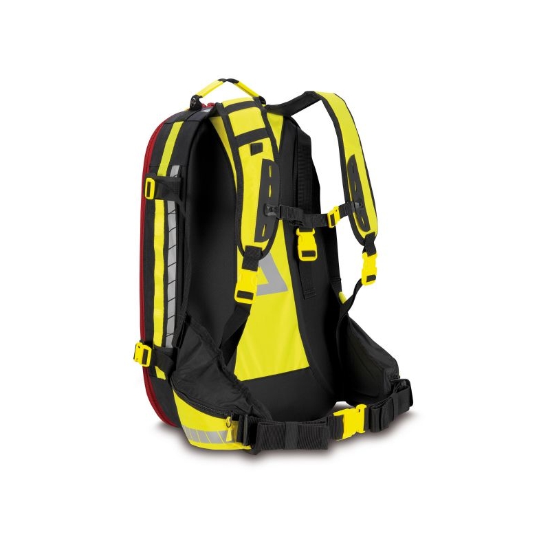 Mochila de emergencia muy ajustada para el rescate en montaña y pistas de esquí. Los laterales de la estructura de la mochila están diseñados y fabricados de un material reflectante de color amarillo brillante para llevar objetos personales, como radios y similares.