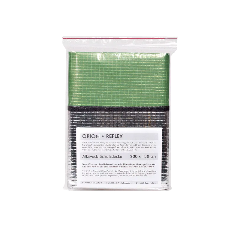 Manta protectora multiusos extremadamente duradera, fácil de limpiar, desinfectable y apta para uso continuo. Material compuesto de triple capa de película de poliéster recubierta de aluminio con malla de poliéster y película de PE.