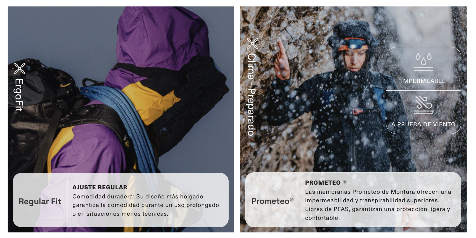 Chaqueta ligera para montañismo: impermeable, transpirable y ergonómica, con Prometeo 3L e inserciones elásticas.