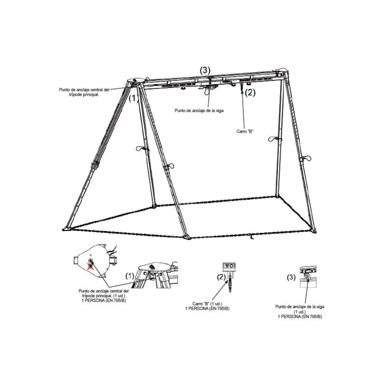 Trípode para acceso en espacios confinados para dos usuarios simultáneamente o cargas de hasta 1000 kg. Trípode formado por un trípode de seguridad y un bípode. Estos elementos pueden separarse para poder ser usados de forma individual.