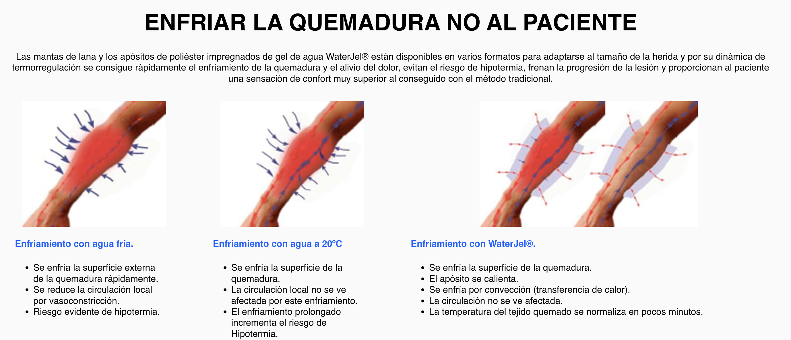 WaterJel es líder mundial en el tratamiento pre-hospitalario de quemaduras. Indispensable en botiquines de primeros auxilios en la industria. hogar y ocio. WaterJel es utilizado a nivel mundial en Hospitales, ambulancias, equipos de rescate y salvamento; por profesionales de la Urgencia y Emergencia, Fuerzas de Seguridad y Bomberos.