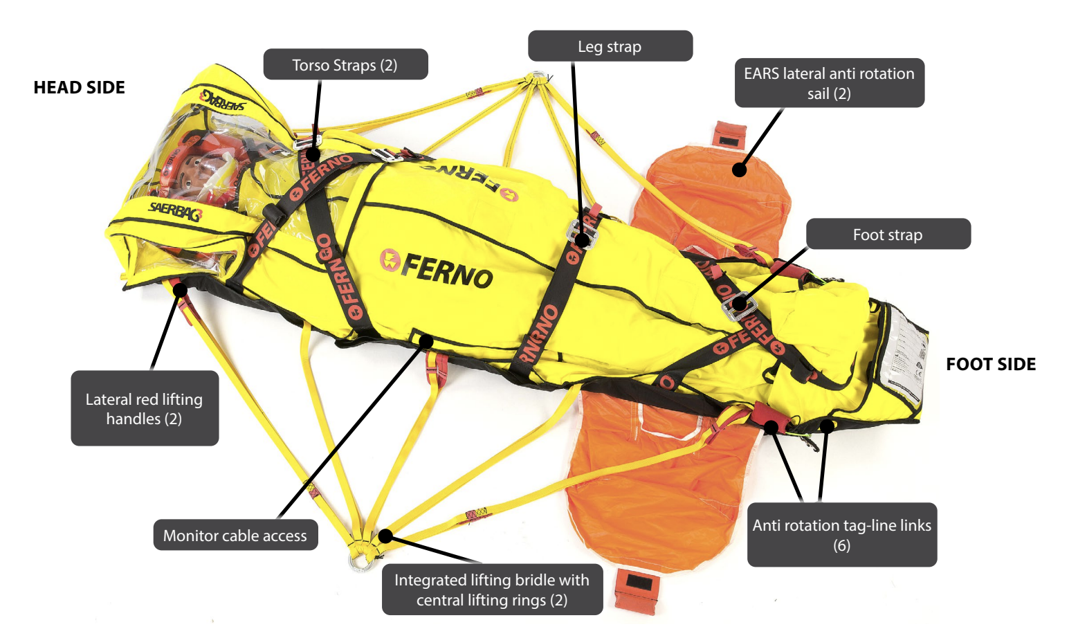 Ligera y compacta, la vela anti-rotación de Ferno minimiza la rotación de la camilla de rescate desde el helicóptero al arriado o izado con el personal de resacate.