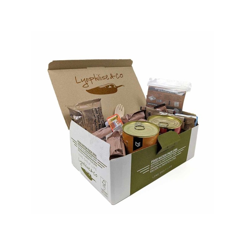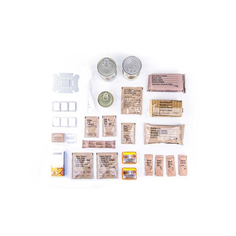 La ración militar es un completo kit de alimentación diseñado para proporcionar una dieta equilibrada y energética de 2000 y 3000 Kcal en 24 horas. Ideal para situaciones exigentes, incluye comidas para desayuno, almuerzo y cena, complementos alimenticios y accesorios imprescindibles para la preparación y consumo de alimentos.