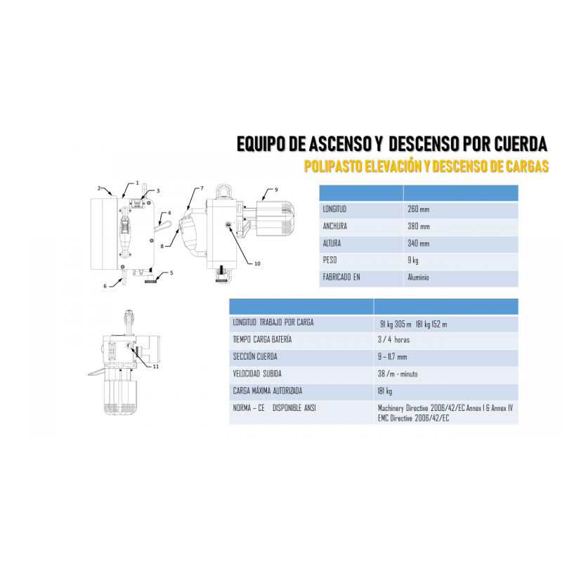 Velocidad de ascenso variable mediante gatillo, que oscila entre 0,15 y 0,5 m/s. Maximo 38m/m