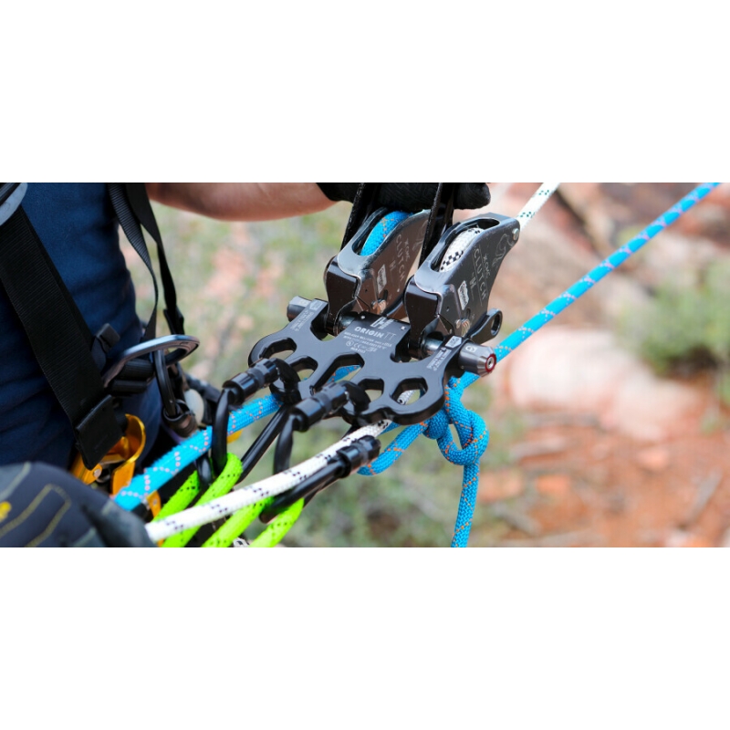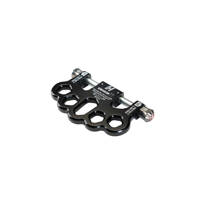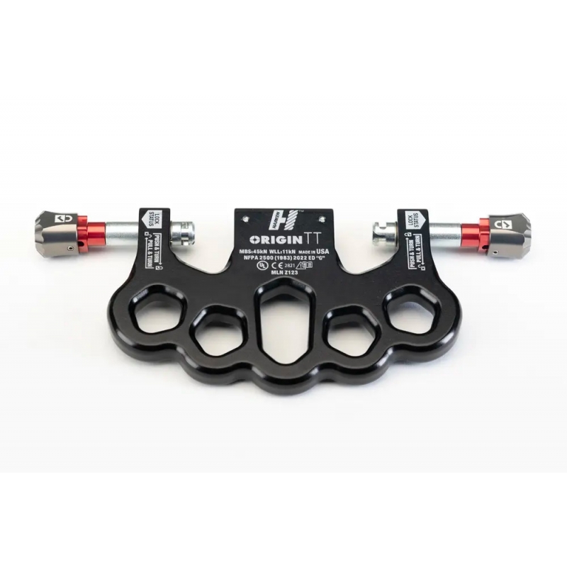 Placa multifunción Origin TT se ha diseñado con el objetivo de mejorar el aparejamiento y el rendimiento de los sistemas de cuerdas gemelas en tensión (TTRS). A diferencia de las placas de aparejamiento que utilizan un sistema de perno único para montar dos dispositivos multifunción en paralelo, Origin TT emplea dos pasadores de seguridad de apertura rápida.