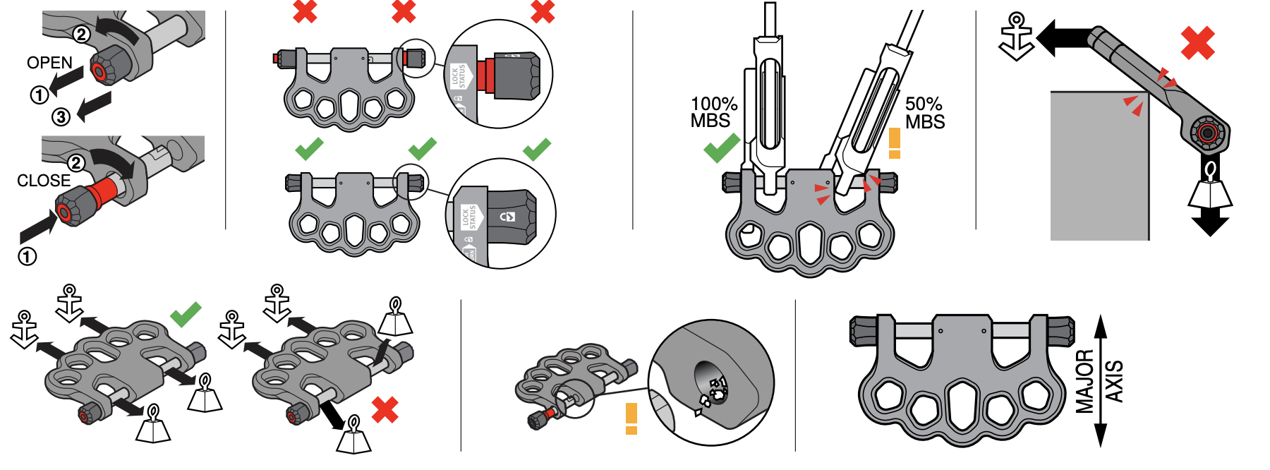El lado de anclaje cuenta con cinco puntos de fijación que permiten el aparejo de sistemas ‘SERENE’ (sistemas Sólidos, Equilibrados, Redundantes, Eficientes, No Extensibles). Al eliminar la necesidad de utilizar mosquetones, se elimina también el juego en el sistema que puede reducir la coordinación entre los dos dispositivos de descenso, que se mantienen directamente adyacentes y alineados.