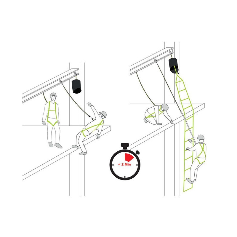 Fijada a una estructura/punto de anclaje mediante el conector fijado en la cinta textil, se despliega hasta el nivel de la víctima y permite que ésta pueda llegar a un lugar seguro (por ascenso o descenso). También puede utilizarse para que el rescatador, asegurado por un tercero, acceda hasta el accidentado.