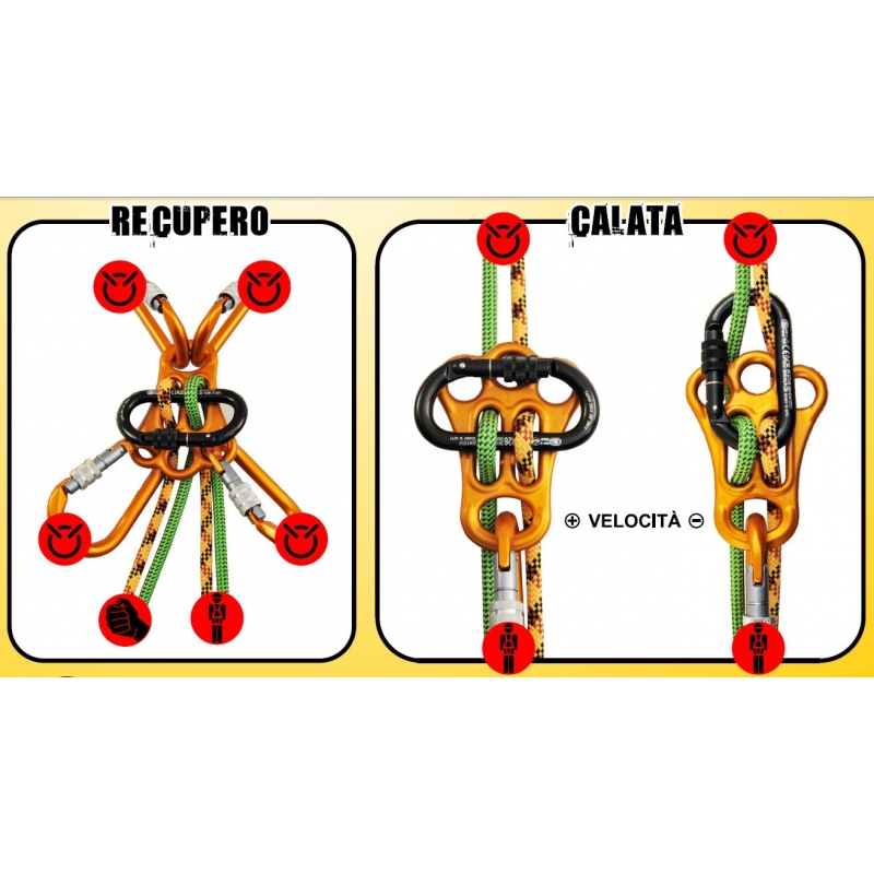 Perfecto para rescates, es ideal para profesionales de la montaña. El amplio orificio superior es capaz de acomodar dos mosquetones para mayor seguridad. Se puede usar como bloqueador de emergencia para remontar por cuerdas fijas. Apta para montaje de polipastos.